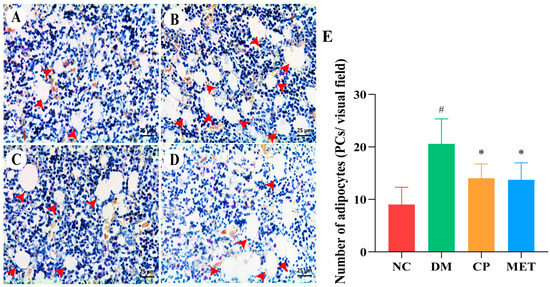 H&E staining, magnification of 400×. (A) Tibia of NC group. (B) Tibia of DM group. (C) Tibia of CP group. (D) Tibia of MET group. (E) Adipocytes numbers in tibial tissue of rats in each group. The red arrow points to adipocytes. The values are presented as mean ± SD. In comparison to the NC group, (#) p < 0.05. In comparison to the DM group, (*) p < 0.05.