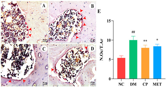TRAP staining, magnification of 400×. (A) Femur bone of NC group. (B) Femur bone of DM group. (C) Femur bone of CP group. (D) Femur bone of MET group. (E) Osteoclast numbers in each group. The red arrows point to osteoclasts. The values are presented as mean ± SD. In comparison to the NC group, (##) p < 0.01. In comparison to the DM group, (**) p < 0.01, (*) p < 0.05.