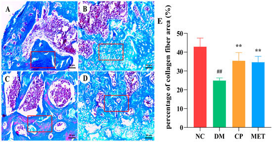 Masson staining, magnification of 200×. (A) Femur bone of NC group. (B) Femur bone of DM group. (C) Femur bone of CP group. (D) Femur bone of MET group. (E) Percentage of collagen fiber area (%) in each group. The red box shows collagen fibers. The values are presented as mean ± SD. In comparison to the NC group, (##) p < 0.01. In comparison to the DM group, (**) p < 0.01.