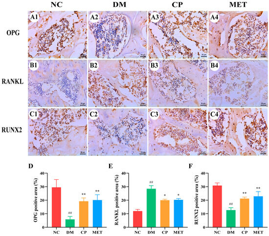Expression of OPG, RANKL as well as RUNX 2 proteins in bone tissue of rats in each group, with IHC staining and magnification of 400×. (A1–A4) OPG; (B1–B4) RANKL; (C1–C4) RUNX 2; (D) OPG positive staining area percentage; (E) RANKL positive staining area percentage; (F) RUNX 2 positive staining area percentage. The values are presented as mean ± SD. In comparison to the NC group, (##) p < 0.01. In comparison to the DM group, (**) p < 0.01, (*) p < 0.05.