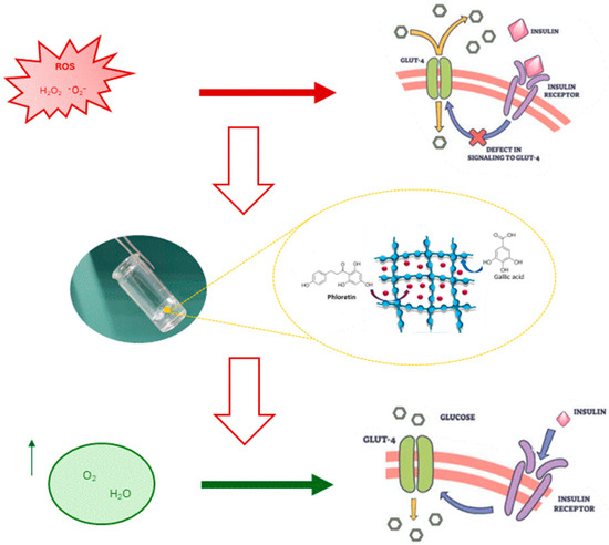 Diabetes mellitus is a metabolic disease characterized by a congenital (type I insulin-dependent) or an acquired (type II non-insulin-dependent) inability to transport glucose from the blood to the cells [1,2]. Chronic hyperglycemia, due to a deficiency in insulin secretion or insulin resistance, implies an increased production of reactive oxygen species ROS responsible for oxidative damage in cellular constituents, including DNA deterioration and peroxidation of proteins and lipids, and the activation of injury and cell death [3]. Specifically, OS pathways would represent a connection between the disruption of the glucoregulatory system and tissue damage [4]. Hyperglycemic conditions can lead to a severe imbalance between ROS generation and antioxidant defense in organs. The source of hyperglycemia-related ROS contains lipid or glucose autoxidation and reduced activity of antioxidant enzymes, including SOD, GPX and CAT, all of which are involved in the antioxidant defense of tissues under diabetic conditions [5]. Once insulin resistance develops, stress response pathways are activated, which increases the expression of regulatory cytokines. In fact, increased ROS can lead to the dephosphorylation of insulin receptors by inhibiting the PI3K-Akt signaling pathway, which in turn leads to a reduction in glucose transporter 4 (GLUT4) translocation for glucose absorption [6]. In this context, literature data suggest that gallic acid, a naturally occurring phenolic acid, possesses pharmacological antioxidant, anti-inflammatory and protective activities against serious metabolic disorders, including cardiovascular diseases and diabetes [7,8]. The phenolic hydroxyl groups of gallic acid are able to interact with other molecules capable of generating free radicals and mediating radical oxidation [9]. They may also inhibit certain oxidative enzymes involved in radical production such as advanced oxidation protein products (AOPP), malondialdehyde (MDA) and oxidized low-density lipoprotein (oxLDL) [10]. The combination with phloretin, another flavonoid with antioxidant properties, could enhance antioxidant action in a hyperglycemic environment where ROS concentration is high and activate the PI3K/AKT signaling cascade to increase GLUT4 translocation and expression, resulting in improved glucose consumption and tolerance [11,12,13].