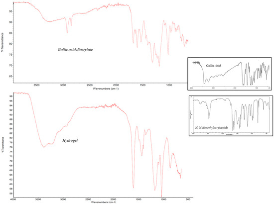 FT-IR spectra of diacrylated gallic acid, hydrogel and of N, N-dimethylacrylamide comonomer and gallic acid. All infrared spectra were recorded with a FT-IR spectrometer in the spectral region from 4000 to 400 cm−1 at an instrument resolution of 2 cm−1. For each spectrum, 25 scans were recorded.