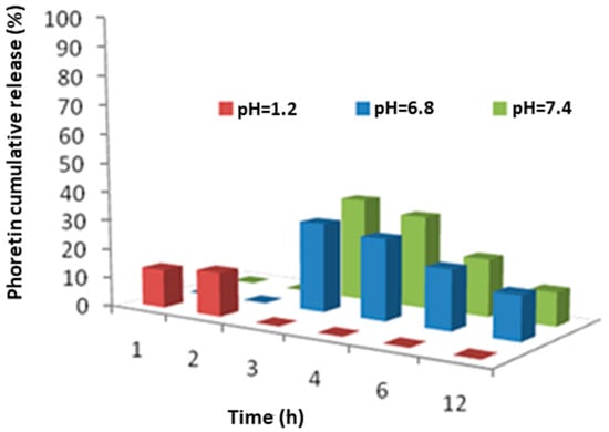 The release tests were conducted in simulated gastric fluid (SGF, pH 1.2), simulated intestinal fluid (SIF, pH 6.8) and simulated colon fluid (SCF, pH 7.4), at different time intervals (1 h, 2 h, 3 h, 6 h, 12 h). From these studies, the ability of the hydrogel to release more phloretin into the intestinal environment at pH 7.4 emerged, thus allowing us to hypothesize the use of this material as a vehicle for phloretin in the intestine (Figure 4).
