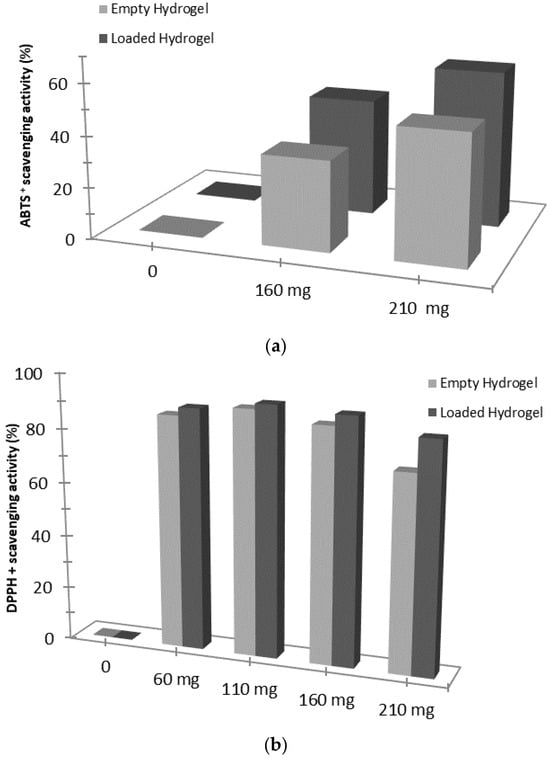 Hydrogels ABTS+ scavenging activity (a) and DPPH scavenging activity (b). Significance was evaluated through the unpaired t-test: p < 0.05.