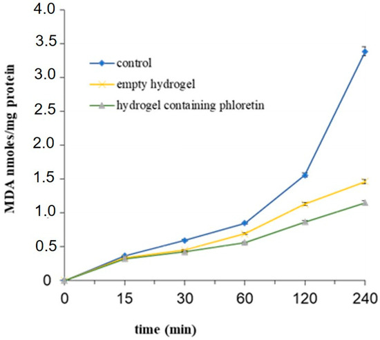 The ability of the gallic acid-hydrogel loaded with phloretin and empty, and subjected to release studies in SGF and SIF, to inhibit lipid peroxidation induced by t-BOOH, a source of free radicals, was examined in rat liver microsomal membranes for a 240 min incubation period. The antioxidant activity of the hydrogel was time-dependent and preserved over time. In fact, as can be seen from Figure 6, control MDA levels increased significantly, indicating the existence of severe oxidative stress [22]. However, after treatment with the empty GA hydrogel, these abnormal indices tended to normalize to significantly lower in the presence of phloretin. These results suggest that the gallic acid-hydrogel containing phloretin effectively attenuated oxidative stress in relation to the synergistic antioxidant activity of gallic acid and phloretin.