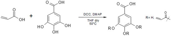 In a three-necked flask equipped with a reflux condenser and a magnetic stirrer, accurately flamed and maintained under inert atmosphere, acrylic acid (0.14 mL, 2 × 10−3 moles) was solubilized in 30 mL of dry tetrahydrofuran (THF). After the addition of DCC (0.42 g, 2 × 10−3 moles) and DMAP (0.05 g, 4 × 10−4 moles), the reaction mixture was kept under stirring and heat (50 °C). After 1 h, the solution was added with gallic acid (1 g, 5.8 × 10−3 moles). The reaction was carried on for about 72 h and under magnetic stirring at 50 °C and monitored through thin-layer chromatography (TLC/silica gel, 7:3 chloroform-methanol eluent mixture). Dicyclohexylurea (DCU) formed during the reaction; it was removed via filtration. The reaction solvent was removed via evaporation under reduced pressure. The obtained product, which was gelatinous in consistency and yellow in color, was purified via column chromatography on silica gel (eluent mixture: chloroform). The purified product was characterized through FT-IR spectrophotometry, GC-MS, and 1H-NMR.
