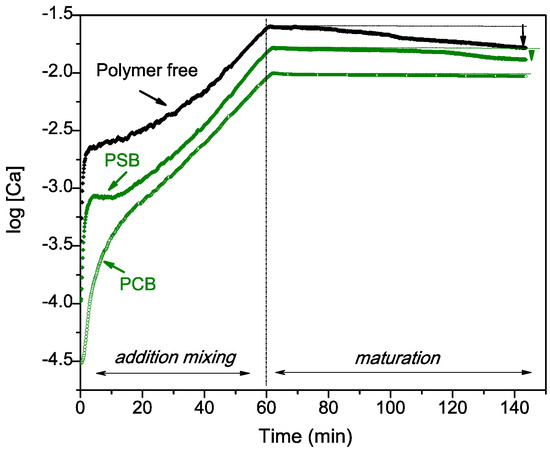 Ionic calcium concentration [Ca] profiles of the two-stage preparation, the addition and maturation of the calcium precursor solution at a constant rate for the three different types of preparations: polymer-free preparations and those synthesized using PSB and PCB.