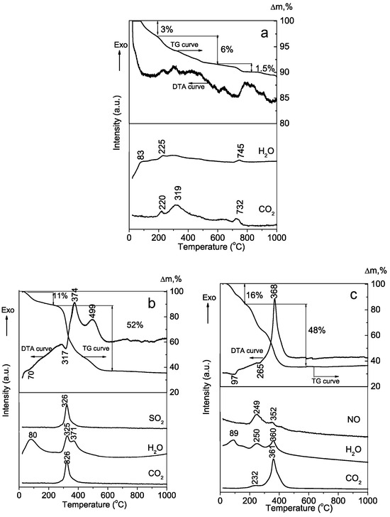 LABSYSTM EVO (Setaram, Caluire-et-Cuire, France) apparatus with a Pt/Pt-Rh thermocouple was used for the thermal characterization of the samples. The analysis was performed in a corundum crucible at a heating rate of 10 °C min−1 within 25–900 °C temperature range and in synthetic air atmosphere. A quadrupole mass spectrometer (Pfeiffer vacuum OM-NISTAR, GSD 301, Zürich, Switzerland) was part of the device and was utilized for the analysis of escaped gas. In the studied samples, the release of H2O (m = 18) and CO2 (m = 44) was determined.