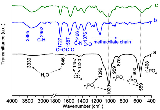 The spectra of the synthesized hybrid materials show peaks for both the polymer and HA. However, it is the PCB hybrid that shows the most important alterations in both the peaks assigned to the vibrations associated with the polymer bonds and also to the phosphate groups of the HA. Of note is the disappearance of all peaks related to the carboxyl group (indicated by the green arrows in Figure 8). An appreciable decrease in the bending vibrations of the phosphate group is also observed. Besides, the red shift of the stretching vibrations of methylene group of PCB in the hybrid material is also significant [46].