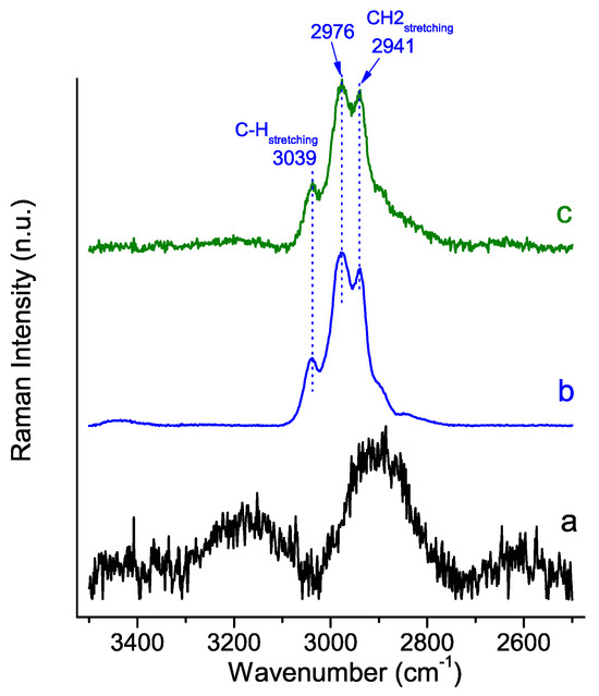 Raman analysis of synthesized HA-PSB hybrid material: (a) HA polymer-free control material; (b) PSB polymer control material; (c) Hybrid HA-PSB material.