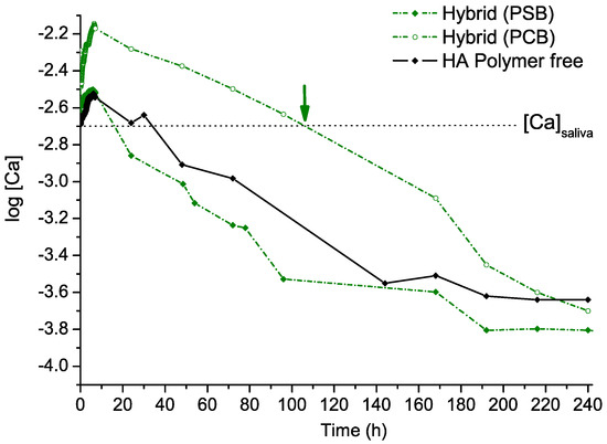 Figure 9 shows the free [Ca2+] time-dependent evolution profiles for the three materials synthesized in our artificial saliva fluid contact experiment. The results show that all three materials release Ca2+ ions into the solutions, increasing the [Ca2+] above the initial value. This increase is very rapid for all three cases during the first 6 h but significantly higher for the PCB hybrid material. Furthermore, for the PCB hybrid material, this Ca concentration remains above the physiological value in saliva for a significantly longer period, over 100 h. In contrast, for the other two materials, the Ca concentration in the artificial saliva fluid decreases below the physiological value in only 24 h. It is interesting to note that artificial saliva is a metastable solution that is saturated with respect to HA. Therefore, an increase in Ca2+ ions will further increase this supersaturation, resulting in an increase in the thermodynamic force for HA crystallization.