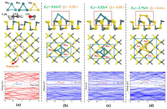 Geometric structures and electronic properties of pure SnS, TM3-SnS (TM = Mo, Ru, Au). (a) Target gases and pure SnS, (b) Mo3-SnS monolayer, (c) Ru3-SnS monolayer, (d) Au3-SnS monolayer. The Eb and band structures are also displayed in Figure 1.