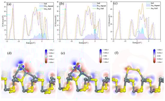 Density of states (DOS) and differential charge density (DCD) analysis of TM3-SnS (TM = Mo, Ru, Au). (a–c) Density of states (DOS) analysis of different doping structures; (d–f) differential charge density (DCD) analysis of different doping structures.
