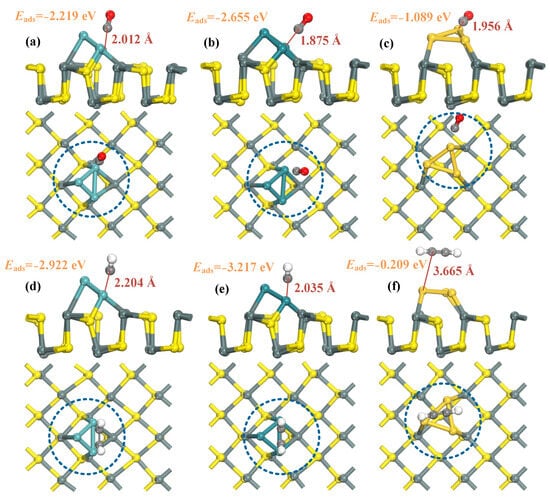 Geometric structures of CO and C2H2 adsorption on TM3-SnS (TM = Mo, Ru, Au). (a–c) CO adsorption; (d–f) C2H2 adsorption.