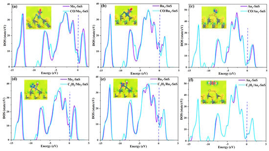 Density of states (DOS) is a critical tool for analyzing electronic properties, especially in revealing the distribution patterns of electronic states at different energy levels, ultimately elucidating the nature of gas adsorption. To further elucidate the adsorption mechanism of target gases on TM3-SnS (TM = Mo, Ru, Au), Figure 4a–f illustrate the density of states (DOS) distributions following the adsorption of CO and C2H2, and the blue dashed line in the figure indicates the Fermi level. DOS reflects the electron density at each energy level, and the higher its peak, the higher the electron density, which can lead to a rapid flow of electrons. It is evident that CO adsorption results in a decrease in electron density near the Fermi level, leading to a reduced filling of electrons between the conduction and valence bands. Such DOS change will make the flow of electrons more difficult, thereby reducing the conductivity of the entire system. Additionally, the three dopants exhibit slightly varied effects on electron distribution: Mo3 primarily reduces electron density to the left of the Fermi level, whereas Ru3 and Au3 dopants mainly impact electron density to the right of the Fermi level. Furthermore, the introduction of CO induces a DOS peak in the range of −10 eV to −7.5 eV for Mo3-SnS and Ru3-SnS, primarily attributed to the influence of d orbitals of metal cluster particles.