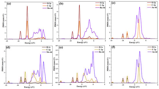 Projected density of states (PDOS) of different adsorption systems. (a–c) PDOS of CO systems, (d–f) PDOS of C2H2 systems.