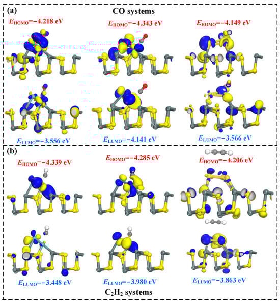 The HOMO and LUMO distribution of different adsorption systems. (a) The HOMO and LUMO distribution of CO systems, (b) The HOMO and LUMO distribution of C2H2 systems.