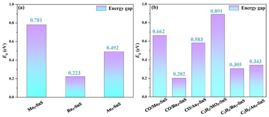 The energy gap value of different adsorption systems. (a) Energy gap of doped SnS, (b) Energy gap of adsorption systems.