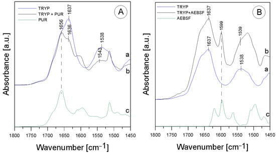 ATR-FTIR spectra for (A)—TRYP (a), TRYP + PUR (b), PUR (c); (B)—TRYP (a), TRYP + AEBSF (b), AEBSF (c).