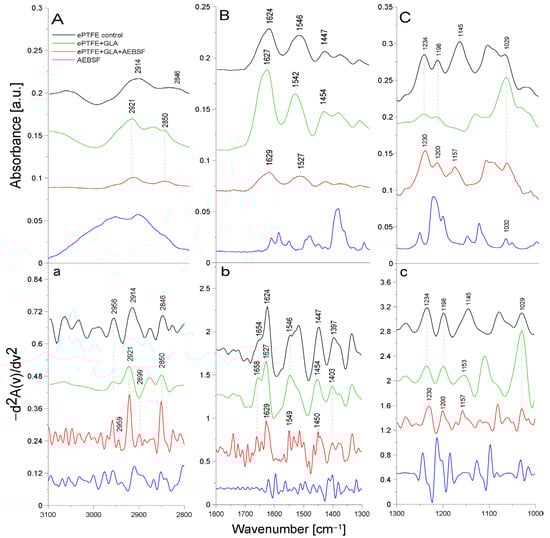 ATR-FTIR spectra of AEBSF: control ePTFE prosthesis (ePTFE control), ePTFE prosthesis functionalized with GLA (ePTFE + GLA), ePTFE prosthesis functionalized with GLA and AEBSF (ePTFE + GLA + AEBSF), AEBSF molecule alone (AEBSF); (A)—3100–2800 cm−1 region of ATR-FTIR spectra, (B)—1800–1300 cm−1 region of ATR-FTIR spectra, (C)—1300–1000 cm−1 region of ATR-FTIR spectra; (a–c)—inverted second derivatives of spectra presented in (A–C).