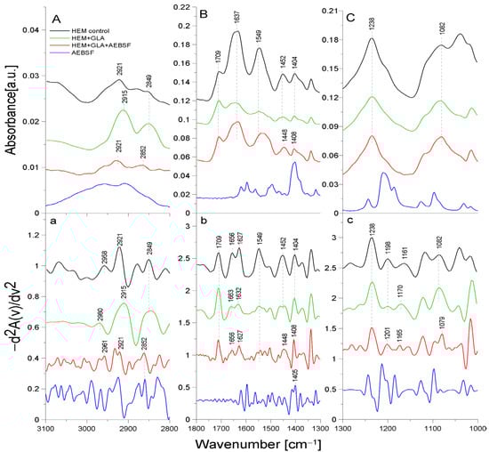 ATR-FTIR spectra of AEBSF: control HEM prosthesis (HEM control), HEM prosthesis functionalized with GLA (HEM + GLA), HEM prosthesis functionalized with GLA and AEBSF (HEM + GLA + AEBSF), AEBSF molecule alone (AEBSF); (A)—3100–2800 cm−1 region of ATR-FTIR spectra, (B)—1800–1300 cm−1 region of ATR-FTIR spectra, (C)—1300–1000 cm−1 region of ATR-FTIR spectra; (a–c)—inverted second derivatives of spectra presented in (A–C).