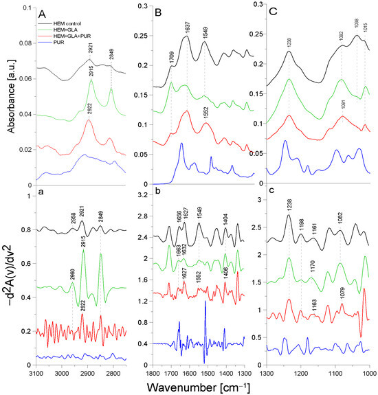 ATR-FTIR spectra of PUR: control HEM prosthesis (HEM control), HEM functionalized with GLA (HEM + GLA), HEM functionalized with GLA and PUR (HEM + GLA + PUR), PUR molecule alone (PUR); (A)—3100–2800 cm−1 region of ATR-FTIR spectra, (B)—1800–1300 cm−1 region of ATR-FTIR spectra, (C)—1300–1000 cm−1 region of ATR-FTIR spectra; (a–c)—inverted second derivatives of spectra presented in (A–C).