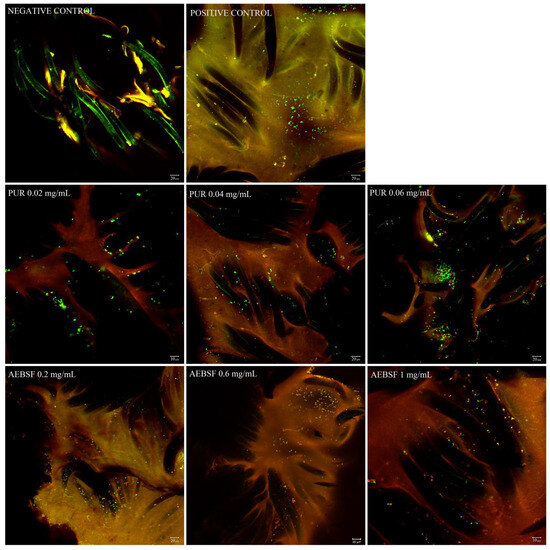 CLSM images of Staphylococcus aureus biofilm formed over 48 h on the HEM prosthesis treated with different concentrations of PUR (0.02 mg/mL, 0.04 mg/mL, 0.06 mg/mL) and AEBSF (0.2 mg/mL, 0.6 mg/mL, 1 mg/mL) for 3 h. Green fluorescence represents live bacteria stained with SYTO 9, whereas red fluorescence represents dead bacteria stained with propidium iodide. Negative control—fibers of the HEM prosthesis; positive control—S. aureus biofilm on the HEM prosthesis. Images were taken at 400× zoom for AEBSF 1 mg/mL and for PUR 0.02 mg/mL; other images were taken at 200× zoom.