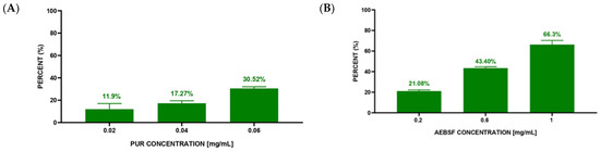 Mortality of S. aureus cells after 3 h of incubation with different concentrations of inhibitors—PUR (A) and AEBSF (B).