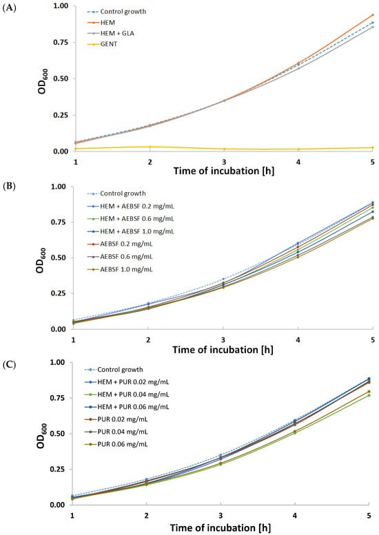 Growth curves for various variants of S. aureus suspension cultures incubated with the addition of (A) gentamicin (GENT), unmodified Hemagard prosthesis (HEM), and GLA-activated Hemagard prosthesis (HEM + GLA); (B) native (AEBSF) and immobilized AEBSF (HEM + AEBSF); (C) native (PUR) and immobilized puromycin (HEM + PUR).