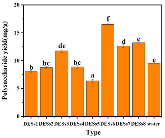 DESs consist of hydrogen bond acceptors in a particular ratio with donors. Physicochemical properties of DESs include solubility, viscosity, and density, among which polarity influences the solubility of polysaccharides. Referring to several articles and considering the polarity and solubility of polysaccharides, eight DESs were selected (described in Section 2.2). The results are shown in Figure 1: DES6 showed the best extraction effect which was higher than that of water under the same conditions, while DES7 and DES6 showed the worst extraction effect. This may be related to the polarity of DESs, and DES6 degrades lignin and cellulose [48], which also enhances its effect on the solubilization of polysaccharides. Therefore, DES6 was chosen for the following experiments.