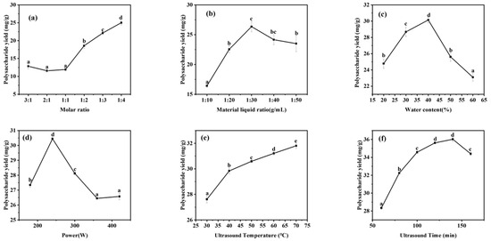 Single-factor assay: (a) Molar ratio; (b) Material liquid ratio; (c) Water content; (d) Power; (e) Ultrasound Temperature; (f) Ultrasound time. Note: values represent mean ± SD of three independent experiments; different letters represent significant differences (p < 0.05).