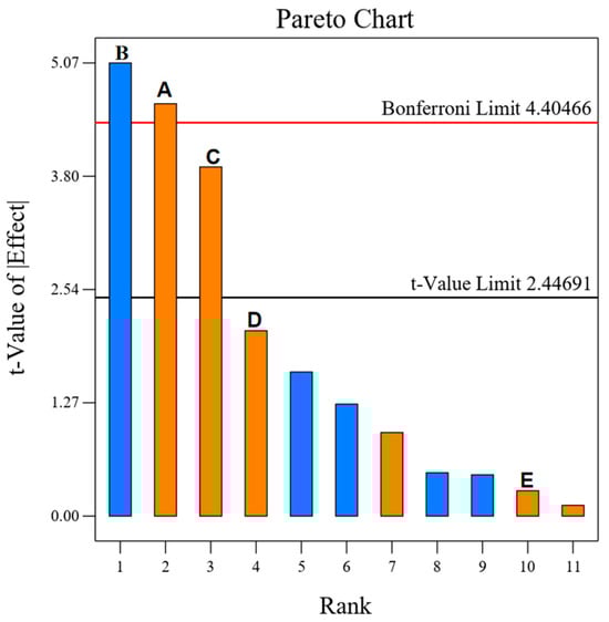 Pareto chart for the 5 factors of the PB experiment: (A) Material-iquid ratio; (B) Water content; (C) Ultrasonic time; (D) Ultasonic temperature; (E) Power.