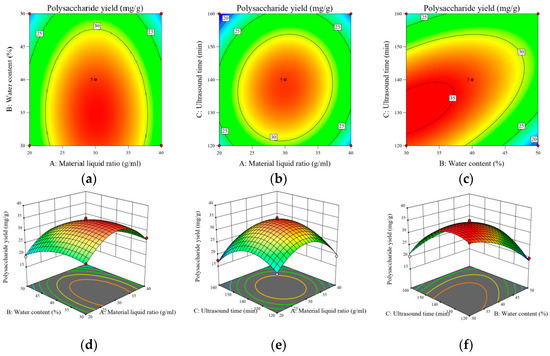 Three-dimensional response surface plots and contour plots (a–f) of the influence of interactions of various factors on the polysaccharide yield of A. senticosus polysaccharides.
