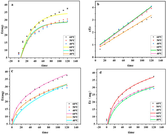 As shown in Figure 7a, one can observe the fitted curves of ASPS extraction by DESs at different temperatures. It can be seen that the polysaccharide leaching rate proliferates at the beginning of extraction; when the extraction time exceeds 40 min, the growth rate of the polysaccharide leaching rate slows down. The initial rapid leaching of ASPS can be attributed to the driving force of water [57]. The secondary leaching model was plotted based on the secondary kinetic data, and Figure 7b shows the relationship between “t/Et-leaching time”. The agreement between the secondary leaching model and the experimental results confirms the hypothesis that there are two central phenomena in the leaching of ASPS: the initial stage (0–40 min), during which the maximum leaching of polysaccharides occurs, and the second stage (40–120 min), during which the leaching of polysaccharides depends mainly on external diffusion and is related to the number of residual polysaccharides in the matrix. Therefore, its extraction rate was slow [58].