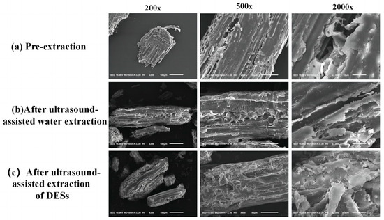 In order to investigate whether the amount of polysaccharide release was related to the degree of destruction of plant cells in the extraction, morphological observations of three A. senticosus powders before extraction, after ultrasound-assisted water extraction, and after ultrasound-assisted DES extraction were carried out in this study at 200×, 500×, and 2000×, respectively. It can be seen that the cells of the pre-extraction powder (Figure 8a) were intact, the texture was clearly visible, and the cell walls were connected together and the surface was smooth without any fracture traces; in comparison, the other two extraction methods caused some damage to the surface of the A. senticosus powders, and the surfaces were rough, with wrinkles and fracture traces. The A. senticosus powder extracted by ultrasound-assisted DESs (Figure 8c) showed greater cellular rupture than that extracted by ultrasound-assisted water (Figure 8b), with obvious ruptures and collapses on the tissue surface and even tiny holes; the overall surface was rough and had many small irregular fragments. This suggests that DES caused damage to the cells; DES breaks down the cell wall and degrades the cellulose [23], so more target fractions are exposed and solubilized in the extract. From this, it can be determined that the degree of rupture of A. senticosus cells has a positive correlation with the effectiveness of ASPS extraction.