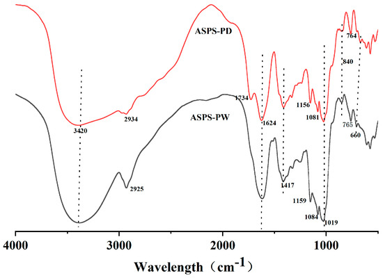 The scanned UV spectra (Figure 10) of the two polysaccharides showed that a weak absorption peak appeared at 280 nm for the two polysaccharides, ASPS-PW and ASPS-PD, indicating that the two polysaccharide fractions contain a small number of proteins, which is consistent with the results of the proteins measured in Table 8.