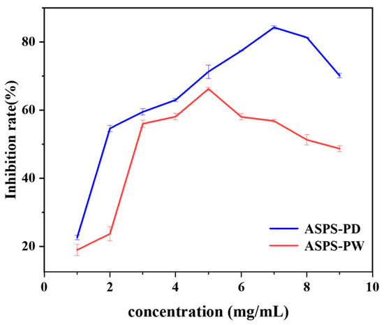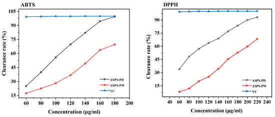 As shown in Figure 11, the scavenging ability of ASPS-PD and ASPS-PW against DPPH and ABTS radicals, respectively, can be observed. It can be seen that as the concentration of the extract increased, its scavenging capacity for DPPH and ABTS free radicals was also more robust. Furthermore, both results showed that the antioxidant property of ASPS-PD was much higher than that of ASPS-PW. The IC50 of ASPS-PD in ABTS was 92.52 ± 3.169 μg/mL; the IC50 of ASPS-PW was 139.857 ± 4.589 μg/mL. The IC50 of ASPS-PD in DPPH was 89.861 ± 6.177 μg/mL; the IC50 of ASPS-PW was 175.943 ± 4.81 μg/mL. The antioxidant effect of polysaccharide extracts may be related to the different compositions of their monosaccharides, and it has been shown that the main active component in polysaccharides is glucuronic acid. The antioxidant results showed that ASPS-PW was more active, and the previous determination of the polysaccharide composition of ASPS-PD showed a higher glucuronic acid content than ASPS-PW, presenting results in agreement.