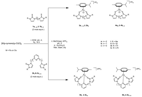 3.3. General Procedure for the Synthesis of the Chelating Bidentate (SS) Alkylimidazole-2-thione-Ru(II)/Os(II) Complexes and the Tridentate (SNS) Pyridine-2,6-diylimidazole-2-thione-Ru(II)/Os(II) Complexes