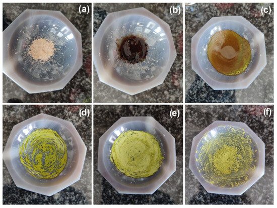 Monitoring of the LAG synthesis of 1 (images obtained under day-light): (a) a dry mixture of [Cu(MeCN)4][PF6] with terpy and PTA in 1:1:1 molar ratio; (b) the reaction mixture with 80 µL of MeCN; (c–f) the reaction mixture after 30, 60, 90, and 120 s grinding, respectively.