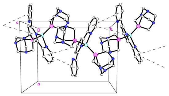The 1D chain motif of cations of 2 connected by stacking interactions (dashed lines; a, b, c—lattice parameters, 0—origin of the coordinate system). Details: H atoms are omitted, C (gray), N (blue), P (magenta), Cu (cyan).