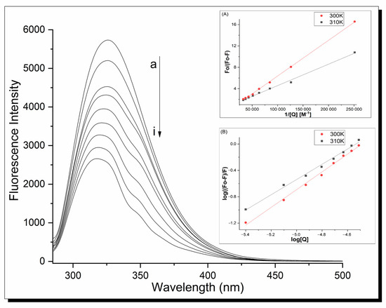 Fluorescence spectra of apo-Tf complex 1 system at 310 K, pH 7.40, λex = 280 nm; inset (A) shows modified Stern–Volmer curves; inset (B) shows plots of log((F0 − F)/F) vs. log[Q] under the same conditions. Analogical spectra were obtained for complex 2.