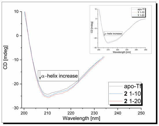 Circular dichroism measurements were used to determine the effect of the copper complexes on the protein’s secondary structure. In the CD spectrum of the apo-Tf in the range 190–250 nm, one intensive negative band at 209 nm, assigned to its α-helical structure, is observed (Figure 7). In the second band, broad and weak, its n-π* transition is assigned to around 218 nm [61]. Under experimental conditions, CD signals originating from metal complexes are not generated. The presence of the 1/2 compound has a modest effect on the apo-transferrin secondary structure, causing some increase in the band intensity without changes in its position.