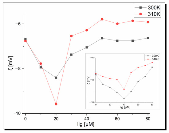 Zeta potential measurements were performed to confirm the existence of protein–copper complexes interactions and determine the stability of the formed adducts. Figure 8 shows a plot of the zeta potential as a complex concentration function at pH 7.40 depending on temperature (300 K and 310 K). It is seen that pure apo-Tf in pseudo-physiological conditions shows a negative zeta potential independent of the temperature. These negative values indicate hydrophobic forces play a key role in the initial interactions among the apo-Tf and copper complexes. Moreover, a decrease in the zeta potential values was observed in the beginning to tend to the final plateau for higher ligand concentrations. The minimum peak position corresponds to the critical induced aggregation concentration of the copper ligand (Cciac) [62]. This point proves the surface of albumin is full and protein–ligand aggregation occurs [63]. As can be seen in Figure 8, the Cciac point is at 20 µM in both temperatures for complex 1 and at a higher concentration, and 40 µM is observed for complex 2. The shapes of the curves are similar but the zeta potential value is lower at the Cciac point at 310 K (−8.40 mV vs. −9.58 mV) in the case of complex 1. All the zeta potential values are higher at 310 K for the apo-Tf-complex 2 system. Based on the theorem that the system is stable when the zeta potential values are higher than ±30 Mv [64], it is seen that under physiological conditions, apo-transferrin-Cu-complex systems show instability, which is very desirable in pharmacology and the design of new drugs and therapies. These results are in agreement with fluorescence studies. In conclusion, temperature affects the zeta potential values but does not influence the Cciac point and stability of the systems.