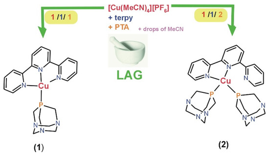 Sustainable synthetic approaches to producing functional coordination compounds hold paramount significance for both the environment and the economy. Therefore, using terpyridine, PTA, and copper(I) precursor, herein, we synthesized, mechanochemically, using liquid-assisted grinding (LAG) two copper(I) coordination compounds, [Cu(terpy)(PTA)][PF6] (1) and [Cu(terpy)(PTA)2][PF6] (2). The synthesis process employs the straightforward application of a pestle and mortar with an ƞ range of 0.82–0.90 µL·mg−1. A stoichiometric two-minute LAG reaction (ratio 1:1:1 and 1:1:2) of [Cu(MeCN)4][PF6], terpyridine, and PTA ligands give, with high yield, [Cu(terpy)(PTA)][PF6] (1) and [Cu(terpy)(PTA)2][PF6] (2), respectively (Scheme 1 and Figure 1). Furthermore, as detailed in this context, the LAG synthetic procedure proves to be rapid, uncomplicated, and energy-efficient, thereby reducing its environmental footprint. Alternatively, compounds 1–2 could be prepared through conventional synthesis in acetonitrile as a solvent. However, this method yields significantly less (see Section 3).