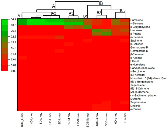 Chemometric analysis, integrating heatmap analysis and principal component analysis (PCA), was performed using OriginPro, version 2023. This analysis was applied to aroma (SDE) and essential oils (HD and SD) extracted from P. nigrum cv Guajarina, considering variations between different parts of the plant and collection times. Heatmap clustering was used to show intricate patterns and correlations, while PCA was used for a comprehensive visualization of variation and underlying structure within the dataset.