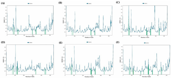 Root-mean-square fluctuations (RMSF) analysis for complexes of ligands (A) Sabinene, (B) β-Pinene, (C) Limonene, (D) δ-Elemene, (E) γ-Elemene and (F) Curzerene with AChE over simulation period of 100 ns. The green line indicates the localized changes in proteins while blue indicates actual fluctuations.