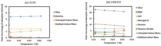 The following supporting information can be downloaded at: https://www.mdpi.com/article/10.3390/molecules29050949/s1, Table S1. Values (in kJ/mol) of London dispersive energy () of n-alkanes and polar solvents adsorbed on silica particles at different temperatures. Table S2. Values (in kJ/mol) of London dispersive energy () of polar solvents adsorbed on silica particles at different temperatures. Table S3. Values (in kJ/mol) of London dispersive energy () of n-alkanes and polar solvents adsorbed on MgO particles at different temperatures. Table S4. Values (in kJ/mol) of London dispersive energy () of polar solvents adsorbed on MgO particles at different temperatures. Table S5. Values (in kJ/mol) of London dispersive energy () of n-alkanes and polar solvents adsorbed on ZnO particles at different temperatures. Table S6. Values (in kJ/mol) of London dispersive energy () of polar solvents adsorbed on ZnO particles at different temperatures. Table S7. Values (in kJ/mol) of London dispersive energy () of n-alkanes and polar solvents adsorbed on monogal-Zn particles at different temperatures. Table S8. Values (in kJ/mol) of London dispersive energy () of polar solvents adsorbed on monogal-Zn particles at different temperatures. Table S9. Values (in kJ/mol) of London dispersive energy () of n-alkanes and polar solvents adsorbed on alumina particles at different temperatures. Table S10. Values (in kJ/mol) of London dispersive energy () of polar solvents adsorbed on alumina particles at different temperatures. Table S11. Values (in kJ/mol) of London dispersive energy () of n-alkanes and polar solvents adsorbed on TiO2 particles at different temperatures. Table S12. Values (in kJ/mol) of London dispersive energy () of polar solvents adsorbed on TiO2 particles at different temperatures. Table S13. Values (in kJ/mol) of London dispersive energy () of n-alkanes and polar solvents adsorbed on untreated carbon fibers particles at different temperatures. Table S14. Values (in kJ/mol) of London dispersive energy () of polar solvents adsorbed on untreated carbon fibers particles at different temperatures. Table S15. Values (in kJ/mol) of London dispersive energy () of n-alkanes and polar solvents adsorbed on oxidized carbon fibers at different temperatures. Table S16. Values (in kJ/mol) of London dispersive energy () of polar solvents adsorbed on oxidized carbon fibers at different temperatures.