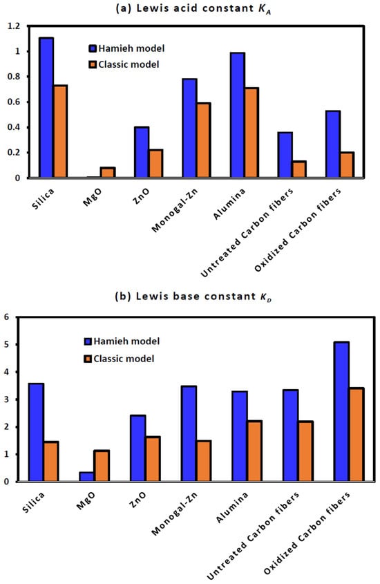 Table 12 also shows a difference in the behavior of the various solid surfaces in interactions with acidic, basic, and amphoteric polar solvents. The acid–base constants of the solid materials were calculated. The obtained values of the Lewis enthalpic acid–base constants and and the Lewis entropic acid–base constants and of the different solid particles are presented in Table 13. The comparison of the acid–base behavior of the different solid materials allowed us to classify them in decreasing order of acidity and basicity.