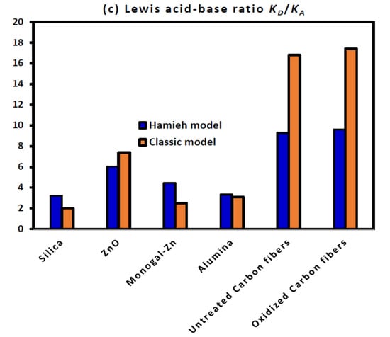 The determination of the polar interaction energy of the different polar molecules adsorbed on the solid materials allowed us to obtain the polar enthalpy and entropy of the interaction and, therefore, the enthalpic and entropic Lewis acid–base constants. The results showed that all studied solid surfaces exhibited amphoteric behavior with stronger Lewis’s basicity. The oxidized and untreated carbon fibers, ZnO, and silica particles showed an important basic force whereas silica, alumina, and monogal-Zn presented the highest Lewis’s acidity.