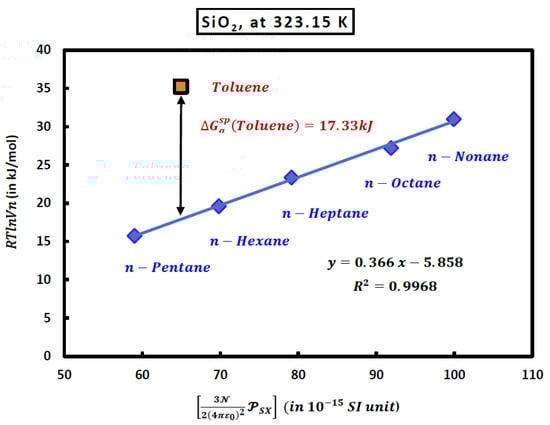 In the case of an adsorbed polar organic molecule, such as toluene, the distance between its representative point given by and the straight line of n-alkanes shown in Figure 5 allowed us to obtain the polar free energy (London dispersion interaction).